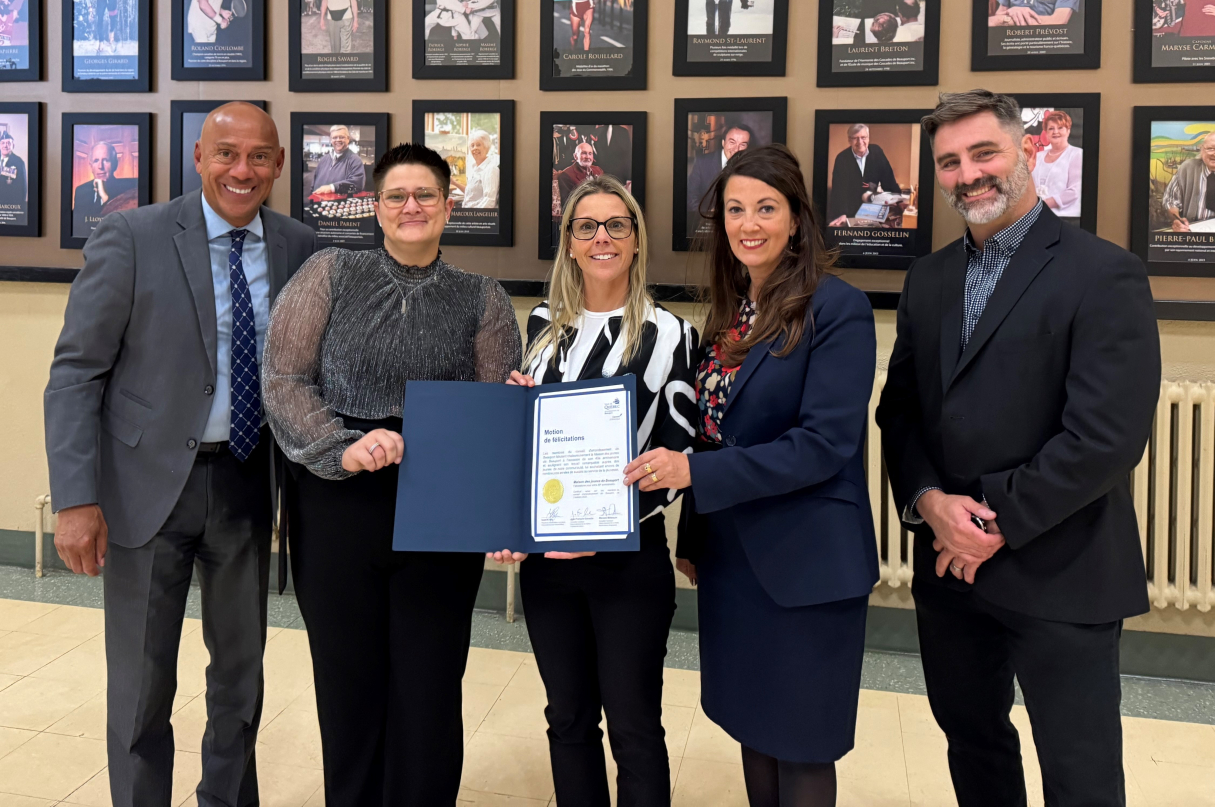 Isabelle Roy remet la motion de félicitations à Kassandra Bolduc, présidente du conseil d’administration, et Marie-Ève Pageau, directrice, en compagnie de Stevens Mélançon, conseiller municipal du district de la Chute Montmorency-Seigneurial, et Jean-François Gosselin, conseiller municipal du district de Sainte-Thérèse-de-Lisieux. (Photo : gracieuseté)