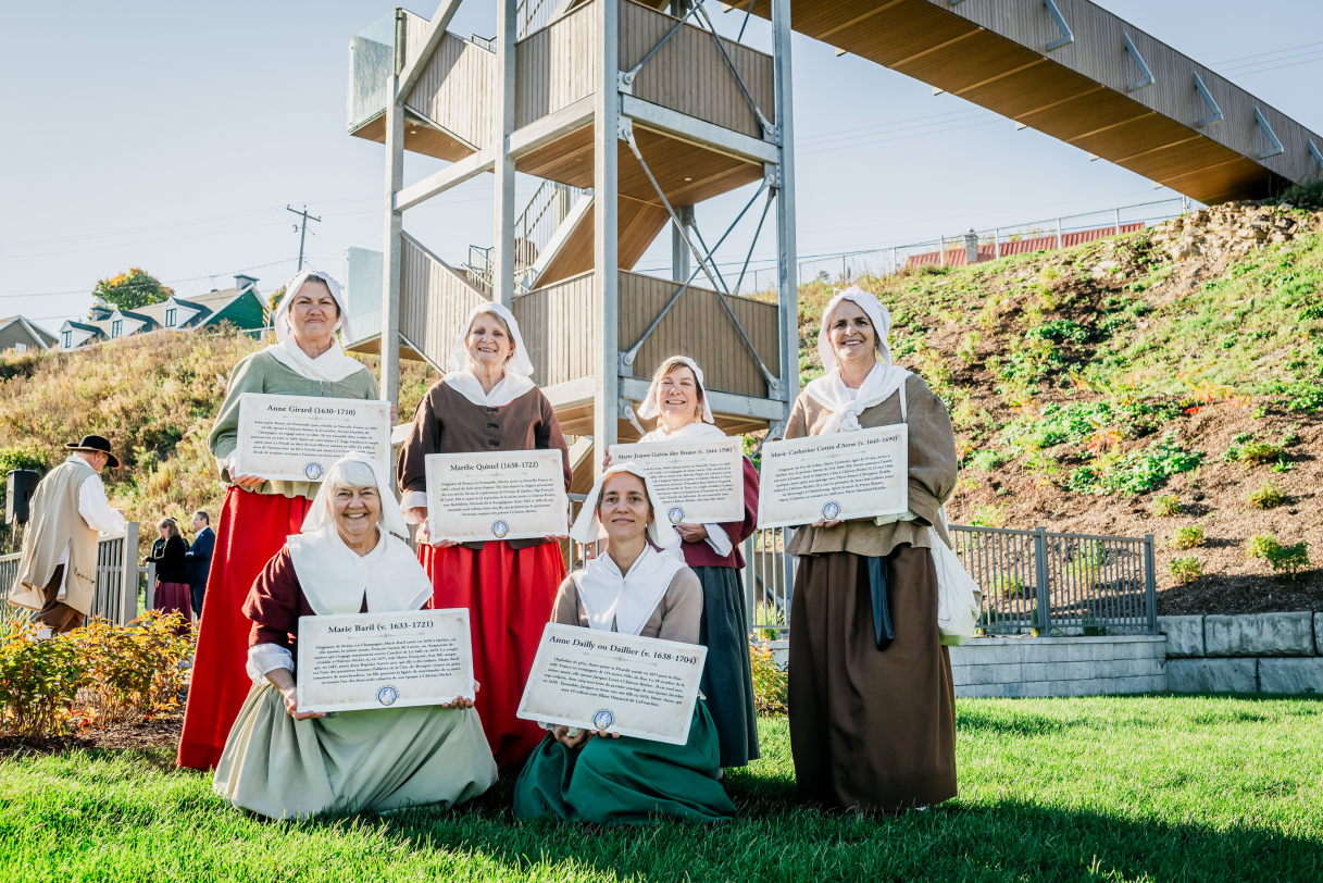 Photo: Les six Filles du Roi venues s’installer à Château-Richer figurent au bas de l’escalier nommé en leur honneur. De gauche à droite, on distingue Anne Girard, Marie Baril, Marthe Quittel, Anne Dailly ou Daillier, Marie-Jeanne Guérin dite Brunet et Marie-Catherine Cottin d’Arras. (Photo : gracieuseté).