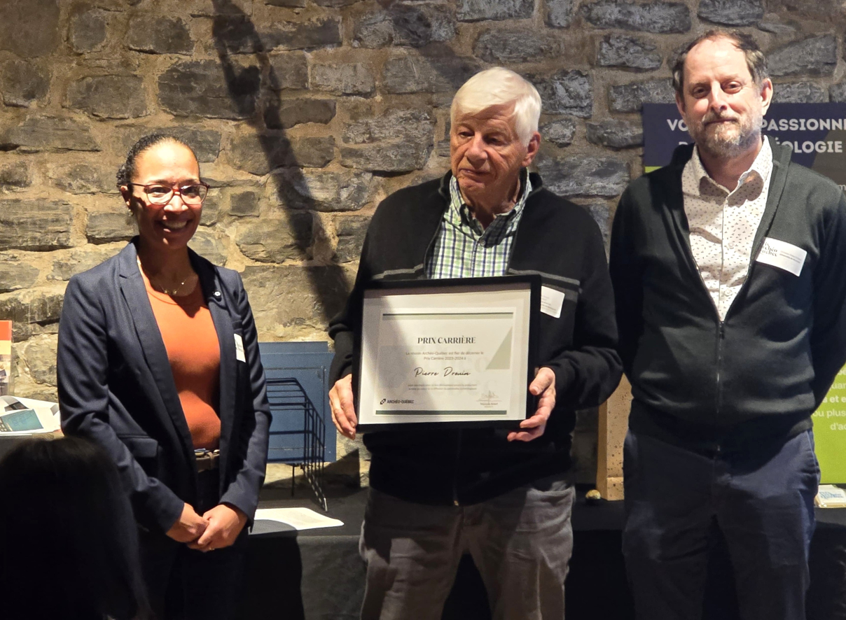 Le réseau Archéo-Québec a décerné le Prix Carrière 2023-2024 à l’archéologue à la retraite de Parcs Canada depuis 20 ans, Pierre Drouin, de Beauport pour son implication et son dévouement envers la protection, la mise en valeur et la diffusion du patrimoine archéologique, lors d’un événement qui s’est déroulé à l’Ilot des Palais, à Québec.