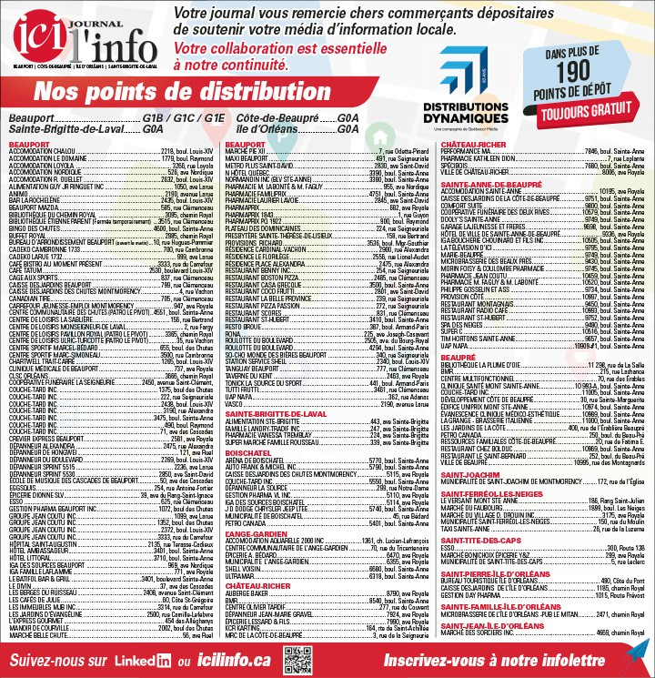 Toujours à l'affût d'une information locale de qualité dans les domaines de l'actualité, de la culture, de l'économie, de la vie communautaire et des sports, le Journal Ici L’Info continue de développer son réseau de points de distribution qui permet d'obtenir gratuitement et facilement des exemplaires en format papier à plus de 190 endroits, commerces, centres de loisirs, bibliothèques municipales, hôtels de ville et entreprises. Un média fait par des gens d'ici pour des gens d'ici consulté régulièrement par plus de 100 000 lecteurs par mois.