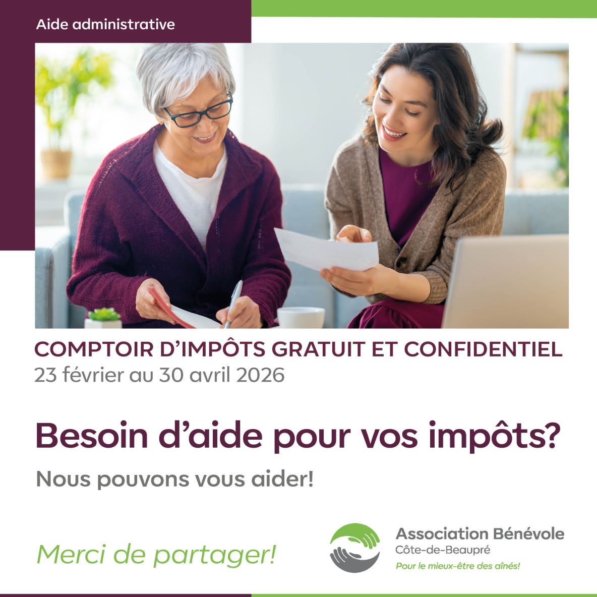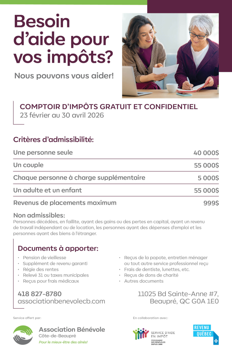 Vous n’êtes pas en mesure de remplir votre déclaration de revenus et vous n’avez pas les moyens de confier cette tâche à des professionnels ? L’équipe de bénévoles expérimentés de L’Association Bénévole Côte-de-Beaupré vous aide à remplir vos déclarations de revenus et à obtenir les crédits auxquels vous avez droit !