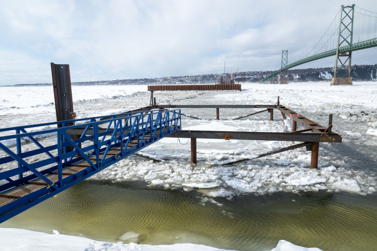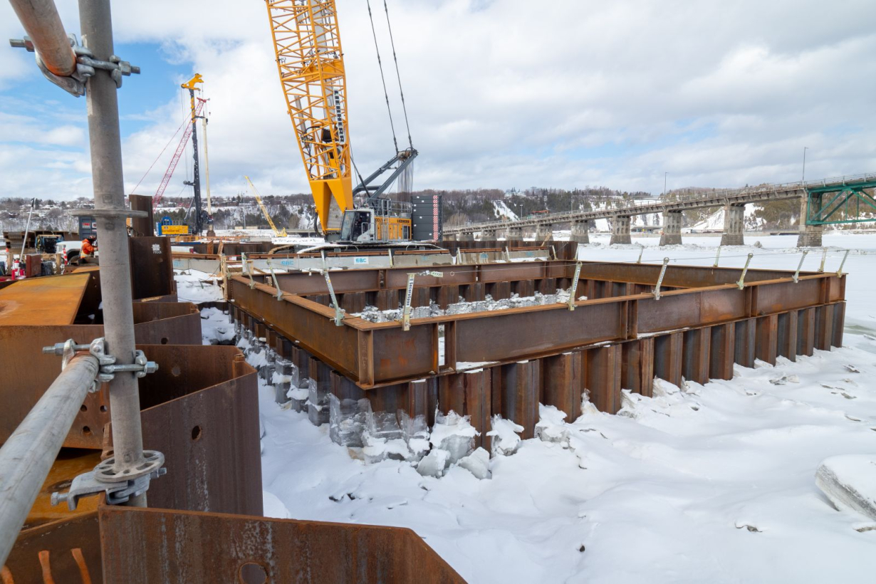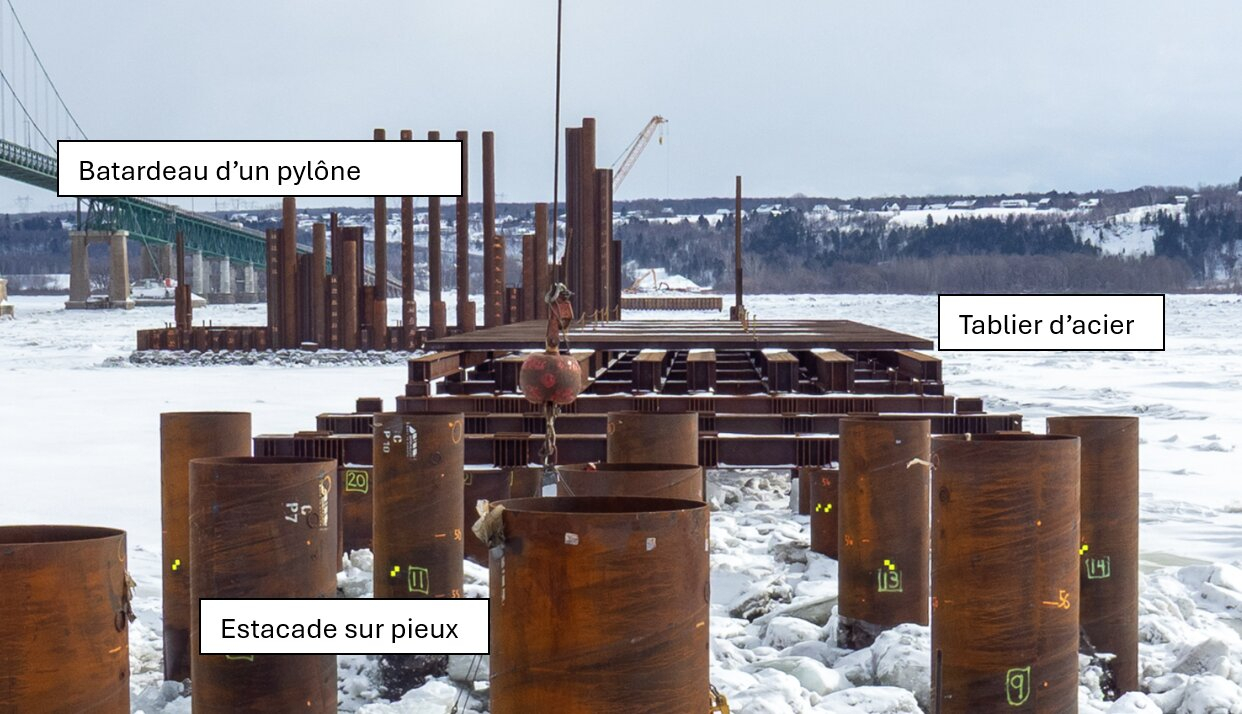 L’installation des pieux des fondations du pont a repris dans les derniers jours, le fleuve étant dégelé. Durant tout l’hiver, des opérations préparatoires ont été réalisées afin que tout soit en place pour la reprise de ces travaux. Des pieux permanents ont notamment été acheminés sur le chantier, du côté de Québec.
