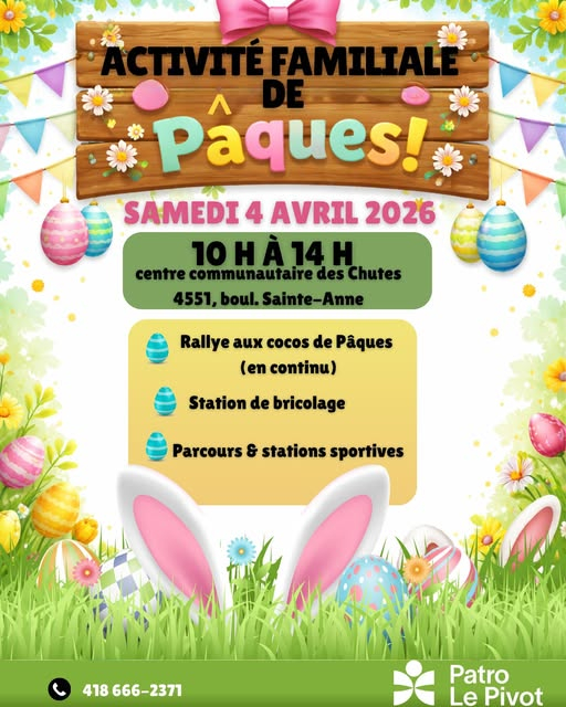 Le Centre communautaire des Chutes situé au 4551, boulevard Sainte-Anne, dans le quartier Montmorency, grouillera d’activités de 10 h à 14 h, aujourd’hui samedi 4 avril, alors que le Patro Le Pivot tiendra sa populaire activité familiale de Pâques.