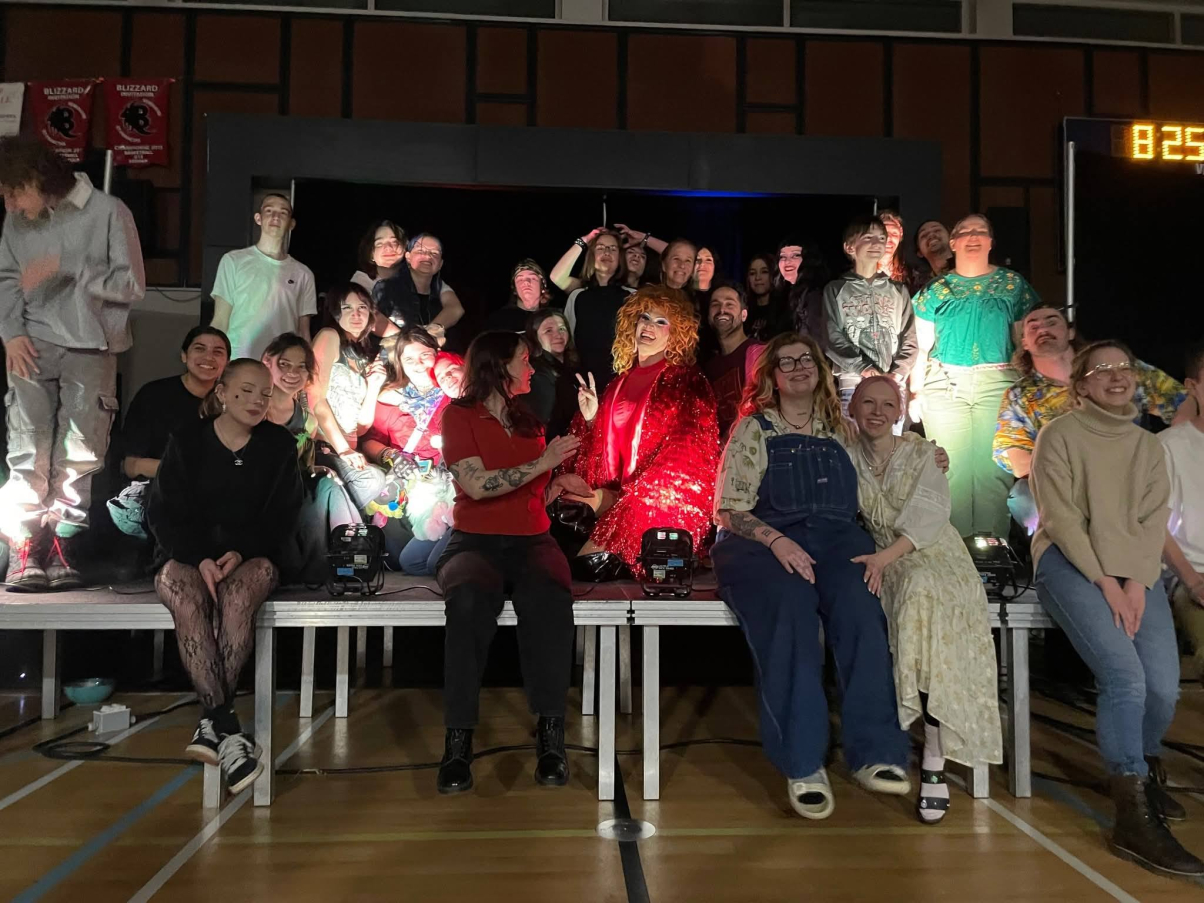 Jojo Bones est entouré de jeunes sur la scène du spectacle-bénéfice présenté le 21 mars au Centre sportif de Boischatel. (Photo : Gracieuseté)