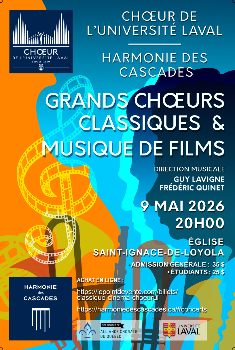 Célébrant son 45e anniversaire de fondation en 2026, l’Harmonie des Cascades de Beauport se réunira avec le Chœur de l’Université Laval pour offrir un grand concert sous le thème « Grands chœurs classiques et musique de films », le samedi 9 mai à 20 h, à l’église Saint Ignace-de-Loyola, dans le secteur Giffard de l’arrondissement de Beauport.