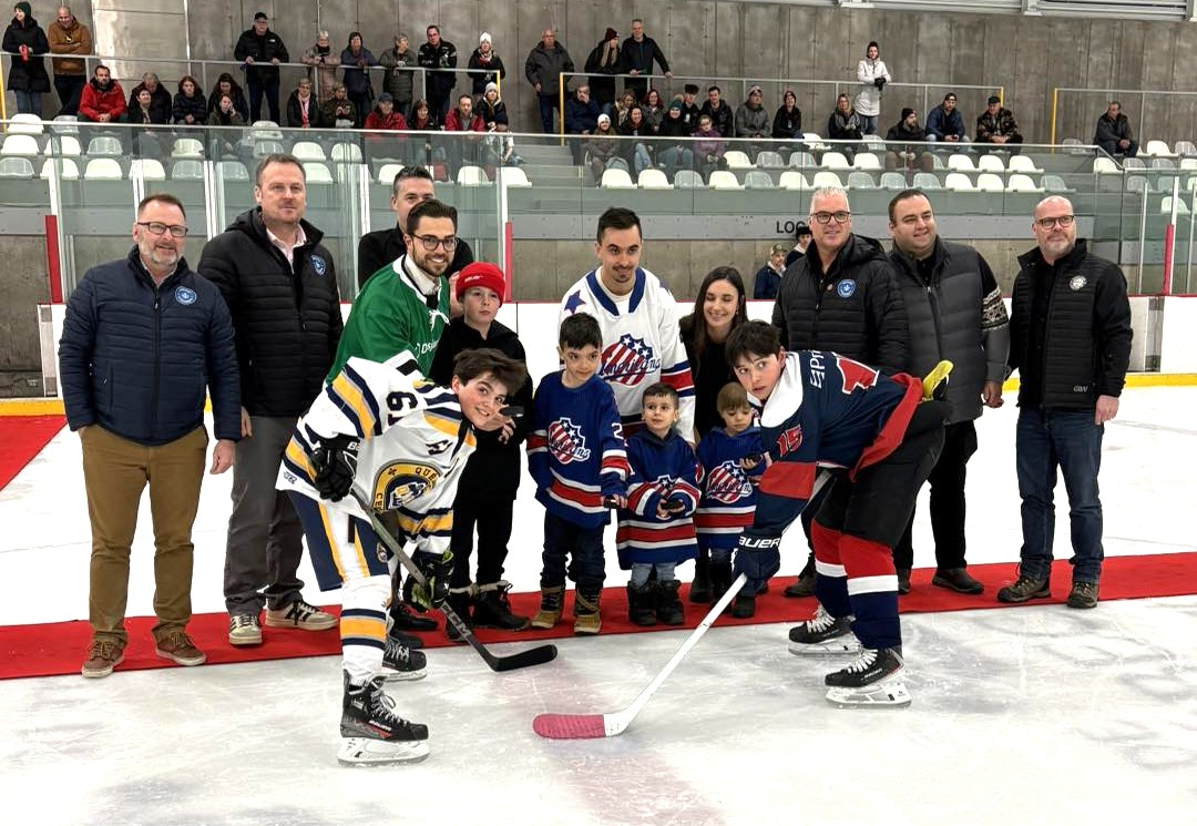Sur la photo de la mise au jeu officielle, de gauche à droite, Richard Cayouette, Hockey Québec-Chaudière-Appalaches (HQCA), Nicolas Pelletier, HQCA, Simon Laplante, directeur du développement de marché chez Desjardins succursale Beauport, Vincent Deblois, LEO EV, et son fils, Anthony Verret et son fils, Emy Verret et son fils, Denis Dumaresq, HQCA, Johnatan Paré, attaché politique du député fédéral de Montmorency-Charlevoix, Gabriel Hardy, et Patrick Hébert, membre du conseil d’administration de SLQNE.(M.B.) (Photo : gracieuseté)