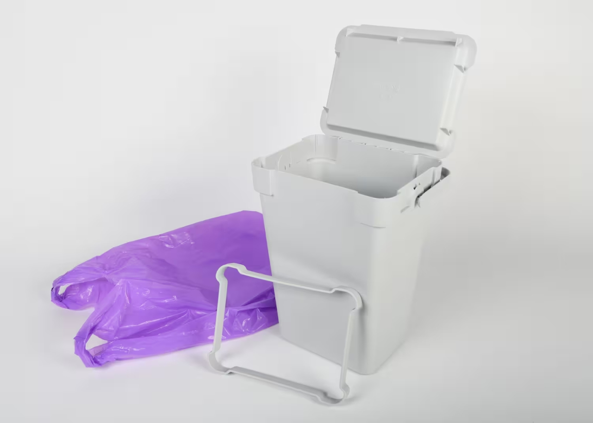 Les résidents de l’Île d’Orléans recevront à compter du 1er mai 2024 un minibac et des sacs mauves pour y déposer leurs résidus alimentaires. Ces sacs mauves devront être mis à la poubelle. (Photo : gracieuseté).