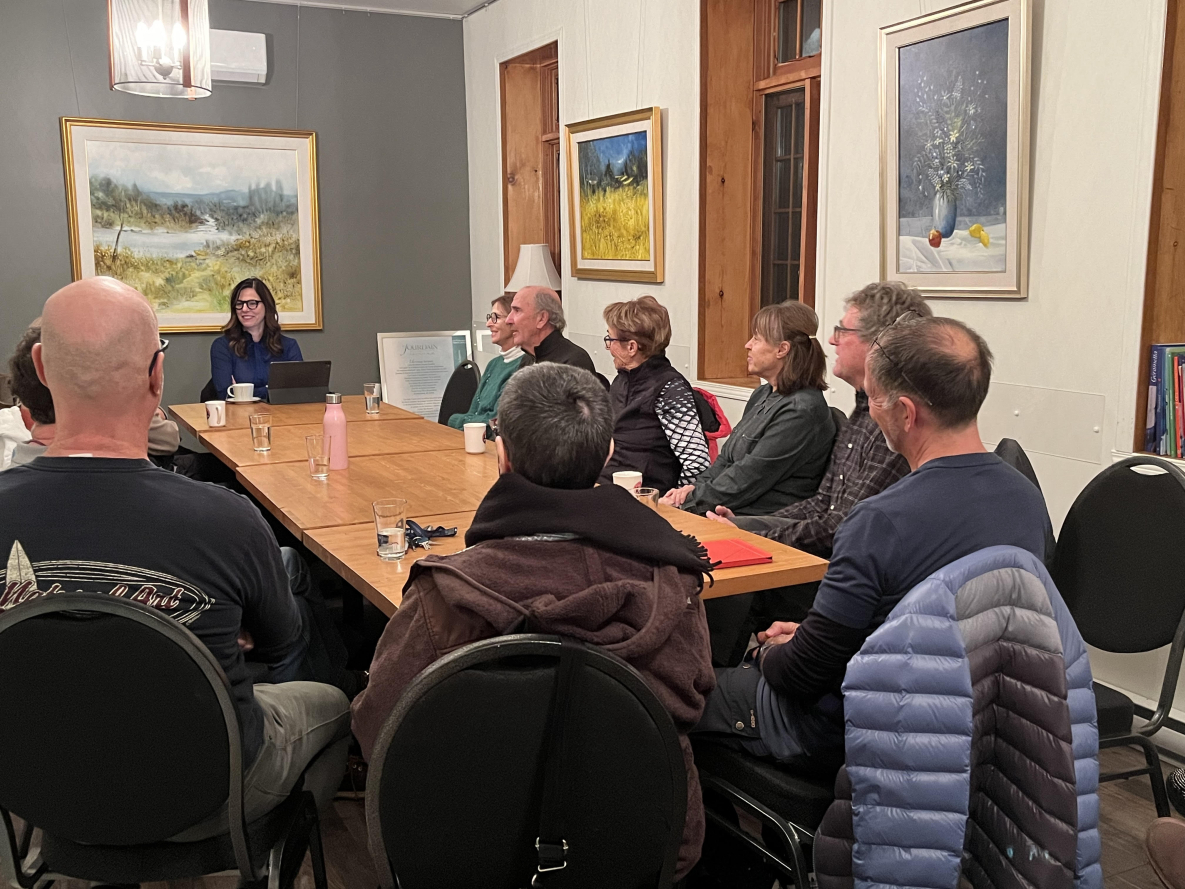 Résidente de Saint-Ferréol-les-Neiges depuis 2021, Mme Blais a choisi la Côte-de-Beaupré pour profiter de sa villégiature exceptionnelle. C’est d’ailleurs sa voisine, Marie Gagnon, qui lui a proposé d’animer des soirées discussions sous différentes thématiques politiques au Saint-Fé Café, dont une première réalisée ce printemps portait sur la situation au Moyen-Orient. Sur la photo, on aperçoit Louise Blais échanger sur la politique américaine avec son auditoire. (Photo : gracieuseté Saint-Fé Café).