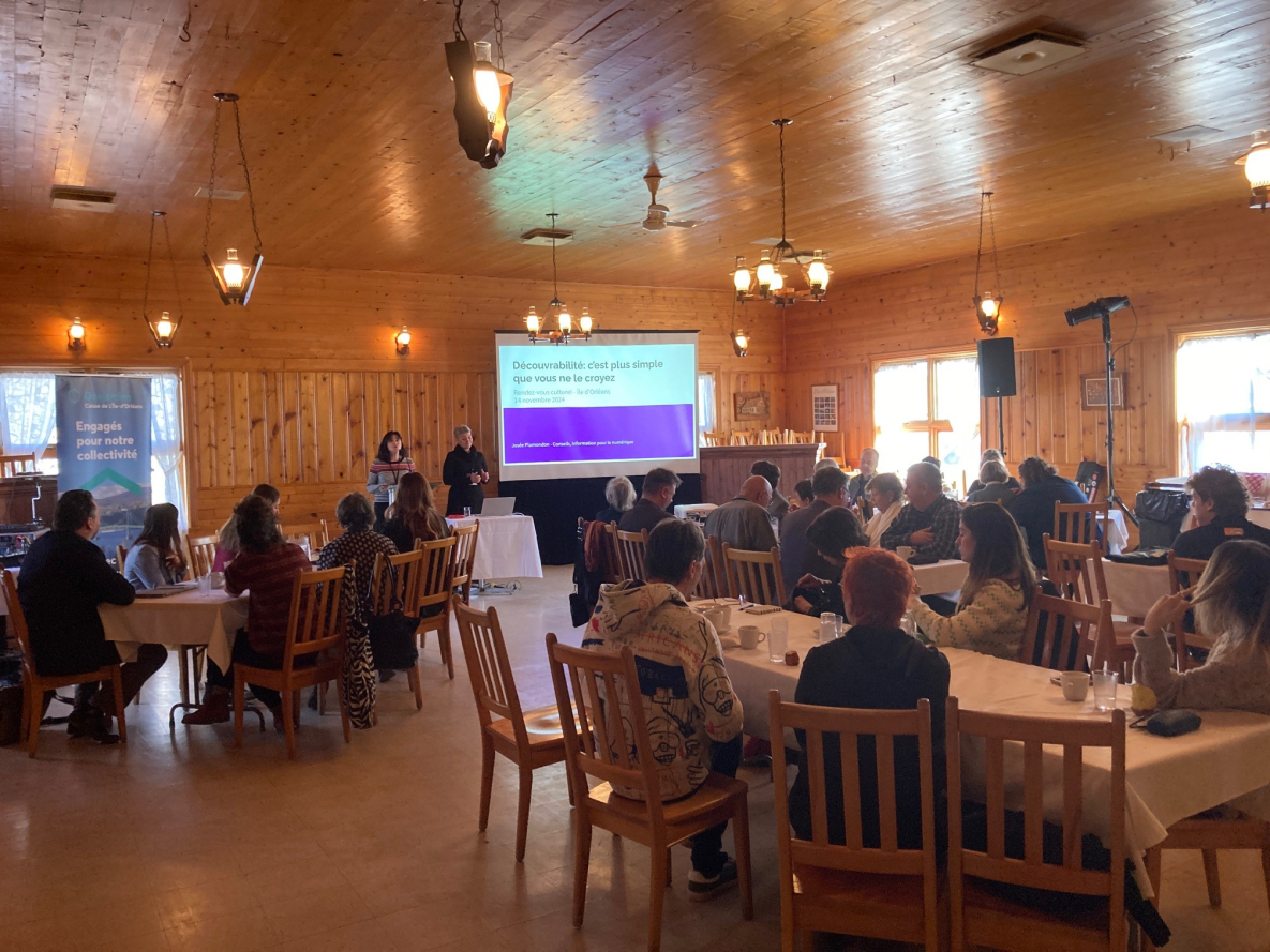 Sur la photo, on aperçoit les participants attentifs à la conférence sur les outils numériques donnée par Josée Plamondon. (J-F. Simard) (Photo : gracieuseté MRC de L’Île d’Orléans).