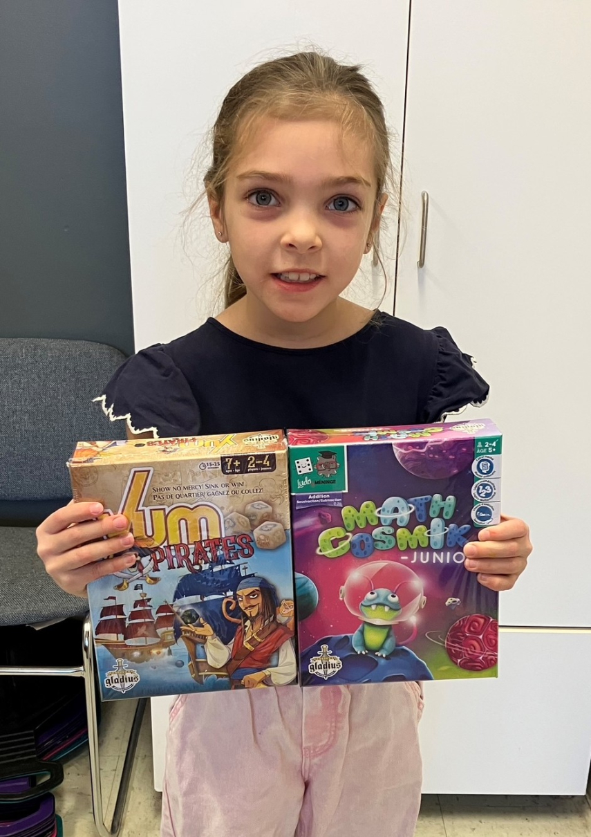 Sur la photo, Juliette présente les deux jeux de société des Éditions Gladius qu'elle a gagnés par tirage au sort parmi tous les participants au concours.