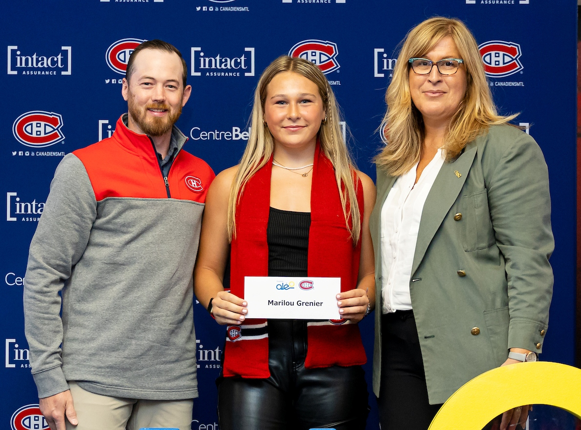Plus de 60 000 $ en bourses ont été remis pour appuyer ces étudiants-athlètes émérites du Québec dans leur poursuite de l’excellence académique et sportive. Sur la photo, Marilou Grenier est accompagnée de Paul Byron, des Canadiens de Montréal et de Patricia Demers, directrice générale de la Fondation Aléo. (Photo Pierre Bourgault / Club de hockey Canadien Inc.)
