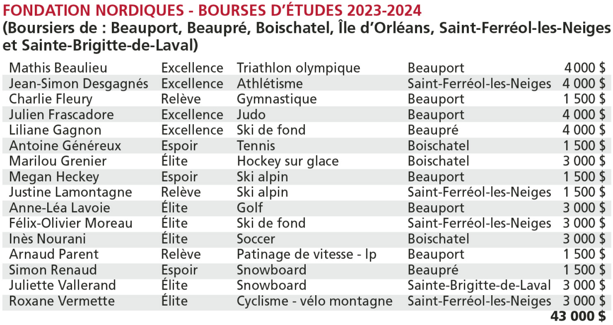 La distribution annuelle de bourses d’études de la Fondation Nordiques a fait plusieurs heureux sur le territoire du journal Ici L’Info où pas moins de 16 athlètes-étudiants se partageront 43 000 $ dans le cadre des programmes «Excellence, Élite, Relève et Espoir» parmi les 121 récipiendaires qui obtiendront plus de 297 500 $ en cette année des Jeux olympiques de Paris.