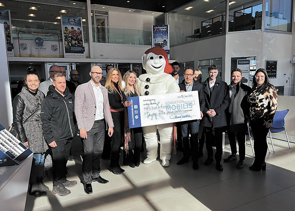Cette année, le bénéficiaire, Michael Godin, profitera d’un montant de 4 200$ pour l’achat de son équipement spécialisé. La remise a eu lieu chez Beauport Hyundai en présence de Charles Drouin, président de la Corporation et Fondation Mobilis, Annie Laliberté, directrice générale/associée de Beauport Hyundai et Genesis de Québec, le personnel de Beauport Hyundai et Genesis de Québec, et Bonhomme Carnaval qui s’est déplacé pour soutenir ce don. Beauport Hyundai appartient au Groupe Daigle, présidé par Paul Daigle. Annie Laliberté et Yves Duval, directeur des opérations fixes, sont tous deux associés avec M. Daigle au sein du distributeur Genesis de Québec qui a l’exclusivité de la distribution de la marque Genesis dans l’Est du Québec depuis ses débuts en 2017. (M.B.) (Photo: gracieuseté)