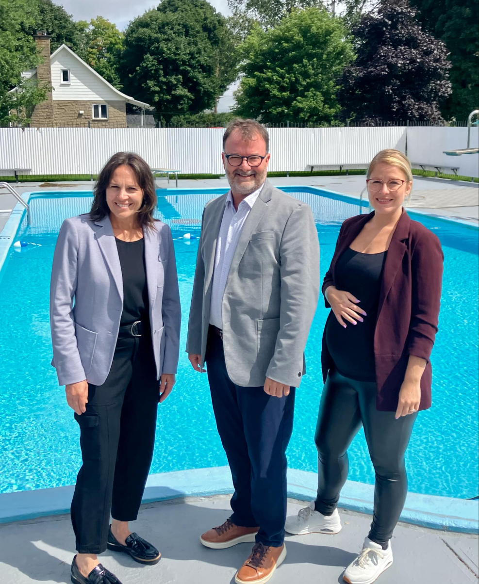 Photo : La ministre Isabelle Charest pose en compagnie du maire de Saint-Pierre, Sylvain Bergeron, et de la députée de Charlevoix-Côte-de-Beaupré, Kariane Bourassa, devant l’actuelle piscine de la municipalité. Celle-ci sera remplacée dès l’été 2026. (Photo : gracieuseté).