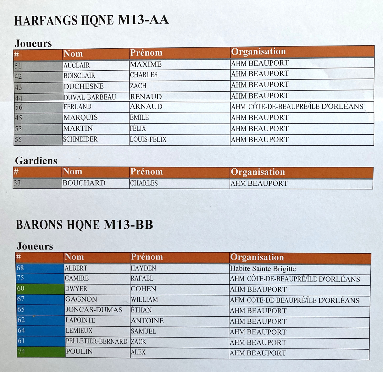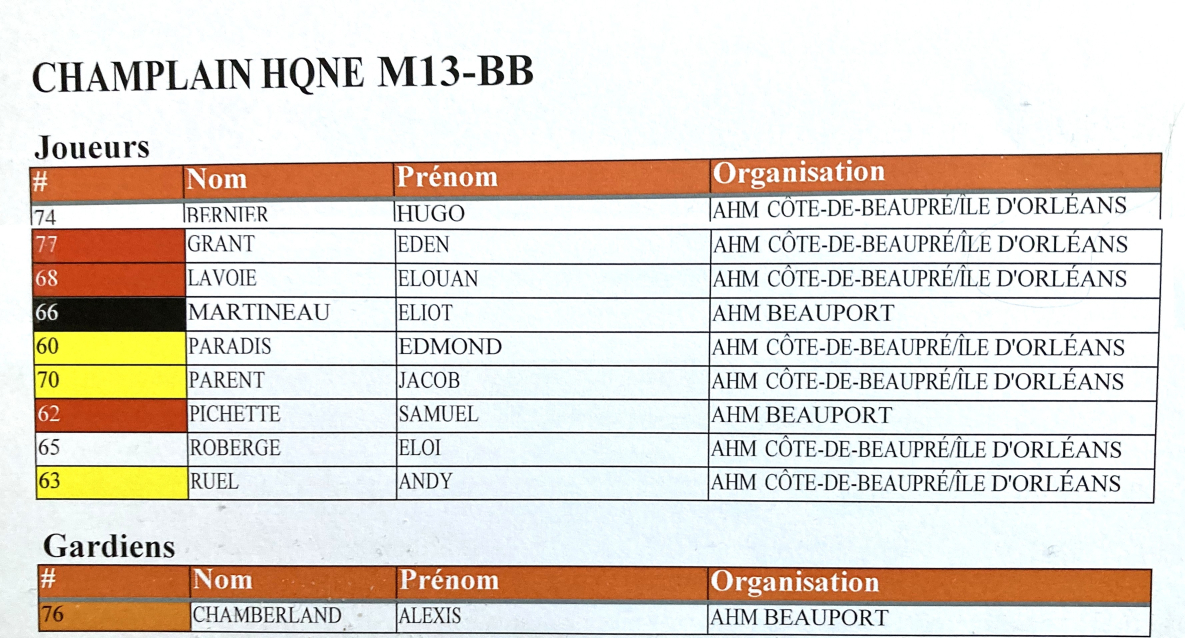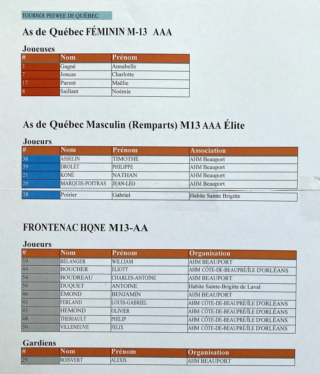 Dans la classe AA-Élites, Timothé Asselin, Philippe Drolet, Nathan Koné et Jean-Léo Marquis-Poitras de Beauport, ainsi que Gabriel Poirier de Sainte-Brigitte-de-Laval font partie des As de Québec M13 AAA Élite qui représenteront les Petits Remparts de Québec, le samedi 15 février à 13 h, face à Team Maryland.
