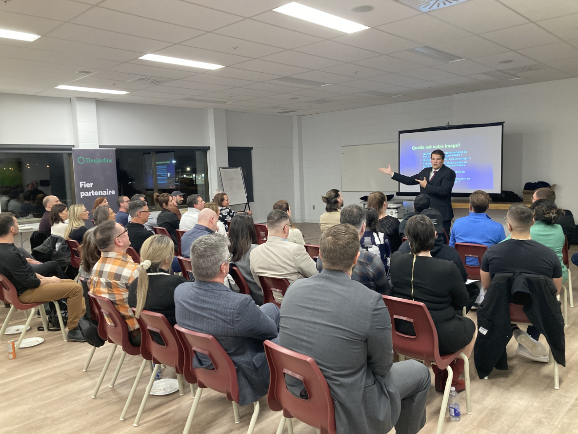 Réunis au Centre communautaire des Chutes, les participants ont alors eu l'opportunité d'explorer les tendances contemporaines et d'optimiser l'impact de chacun de leurs investissements grâce à ce vulgarisateur expert qui a profité de l’occasion pour mettre en valeur les contenus enrichissants de ses 10 livres sur le marketing et la communication, les trucs publicitaires, comment bâtir sa stratégie média et quel média choisir pour sa publicité. (Photo : Michel Bédard)