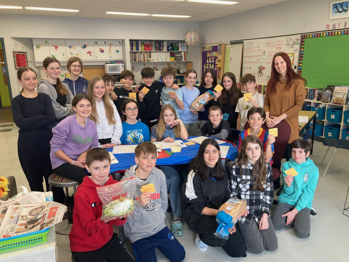 Les élèves de la classe de 6e année de Sandra Martel sont fiers de contribuer à l’importance du partage auprès des personnes démunies de leur communauté. (Photo : Michel Bédard)