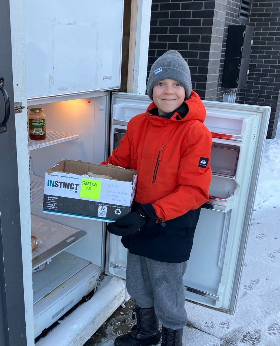 Un des élèves de la classe, Zach Girard, est allé porter en fin d’après-midi des sandwichs faits le matin au frigo-partage du Patro Le Pivot au centre communautaire des Chutes. (Photo : gracieuseté)
