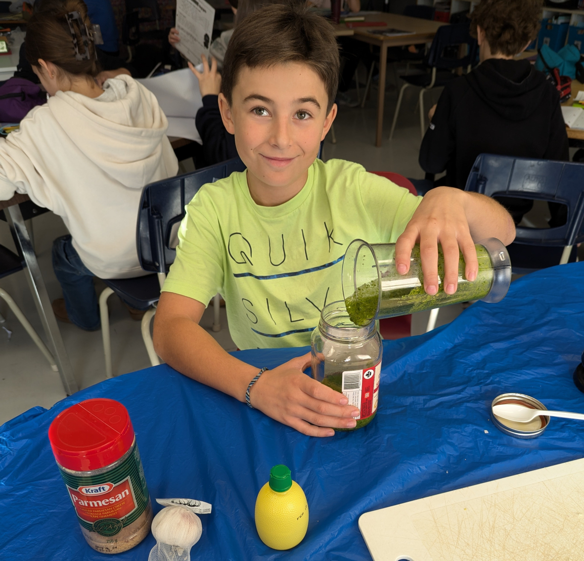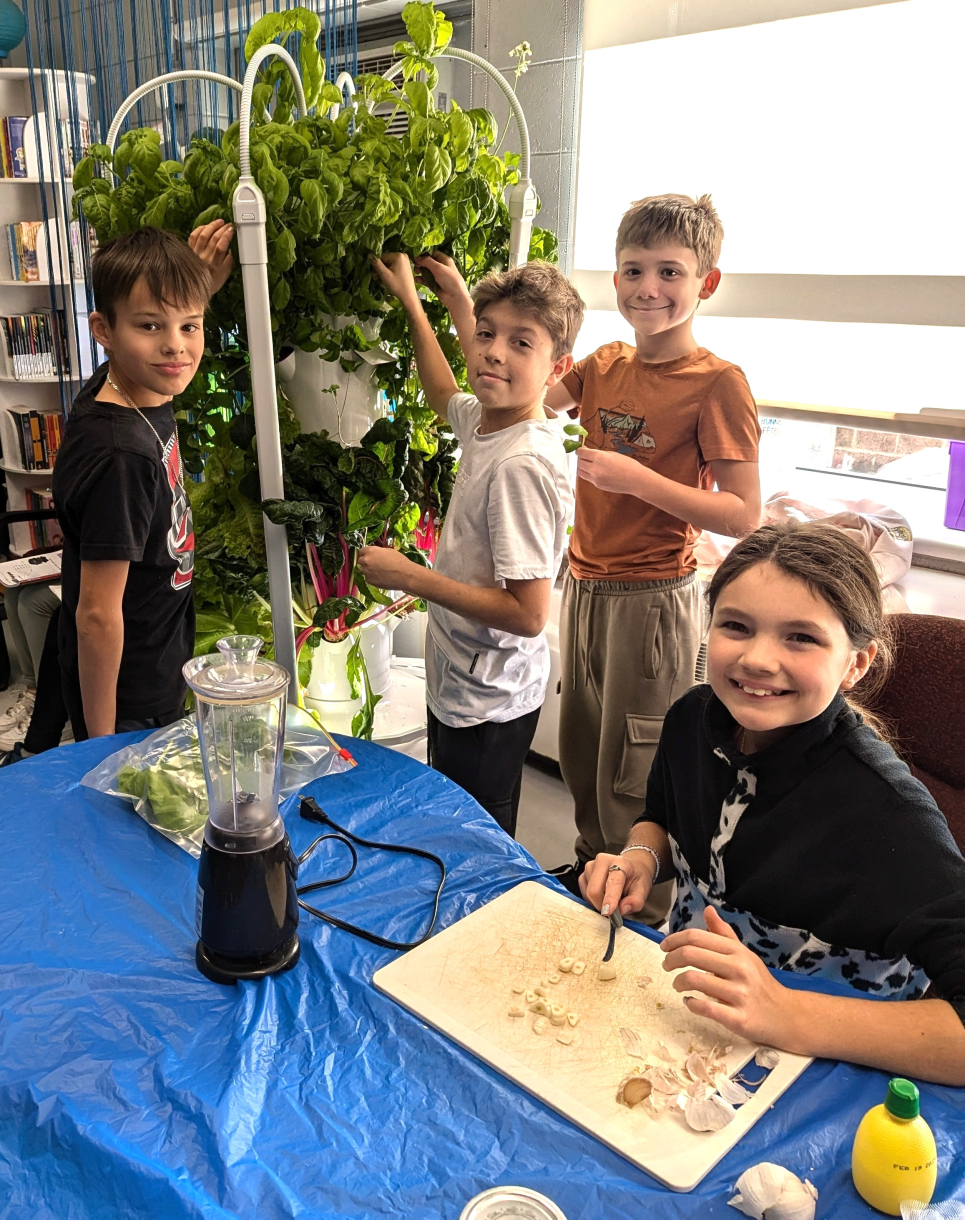Possédant depuis l’an dernier dans sa classe une tour jardin hydroponique programmée, l’enseignante y fait pousser avec ses élèves une variété de plantes et et herbes aromatiques comme du basilic, de l’origan, du persil, de la salade mixte et de la roquette qui seront ensuite utilisées dans des recettes comme des pâtes au pesto ou des sandwichs en vue d’être transportés par des élèves au site frigo-partage du Patro Le Pivot au centre communautaire des Chutes.