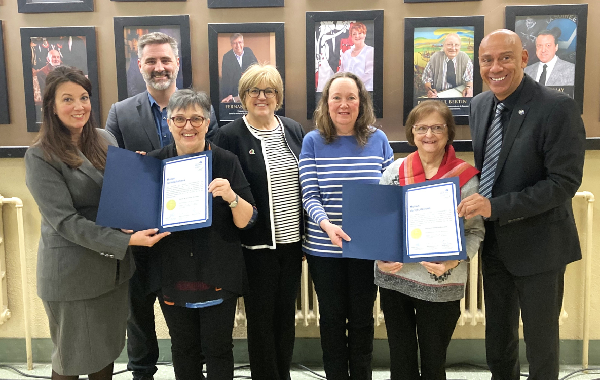 La présidente du conseil d’arrondissement, Isabelle Roy, et le conseiller municipal du district de la Chute Montmorency-Seigneurial, Stevens Mélançon, remettent les certificats de félicitations à la présidente Jacqueline Fournier et Carole Bonnelly, membre du cercle, en compagnie de Jean-François Gosselin, conseiller municipal du district de Sainte-Thérèse-de-Lisieux, Suzanne Dorval, conseillère en action communautaire et Nicole Boutin, vice-présidente. (Photo : Michel Bédard)