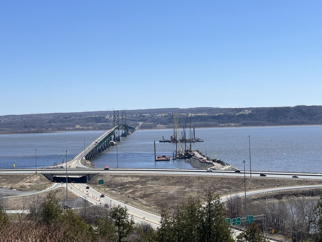 Sur la photo, les travaux de construction du nouveau pont de l’Île d’Orléans sont maintenant entamés. Certaines entraves sont à prévoir à l’entrée du pont actuel pour permettre l’accès au chantier. (Photo : gracieuseté MTMD).