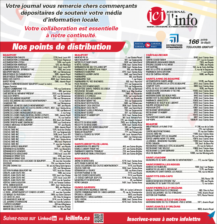 Devant composer encore une fois avec l’incertitude d'une rupture de services à Postes Canada qui assure depuis plusieurs années la distribution mensuelle de 25 000 à 30 000 exemplaires de journaux dans de nombreux foyers de son vaste territoire de Beauport, la Côte-de-Beaupré, l’Île d’Orléans et Sainte-Brigitte-de-Laval, le Journal Ici L’Info continue de développer son réseau de points de distribution qui permet maintenant d'obtenir facilement des exemplaires en format papier à plus de 166 endroits, commerces, centres de loisirs, bibliothèques municipales, hôtels de ville et entreprises .