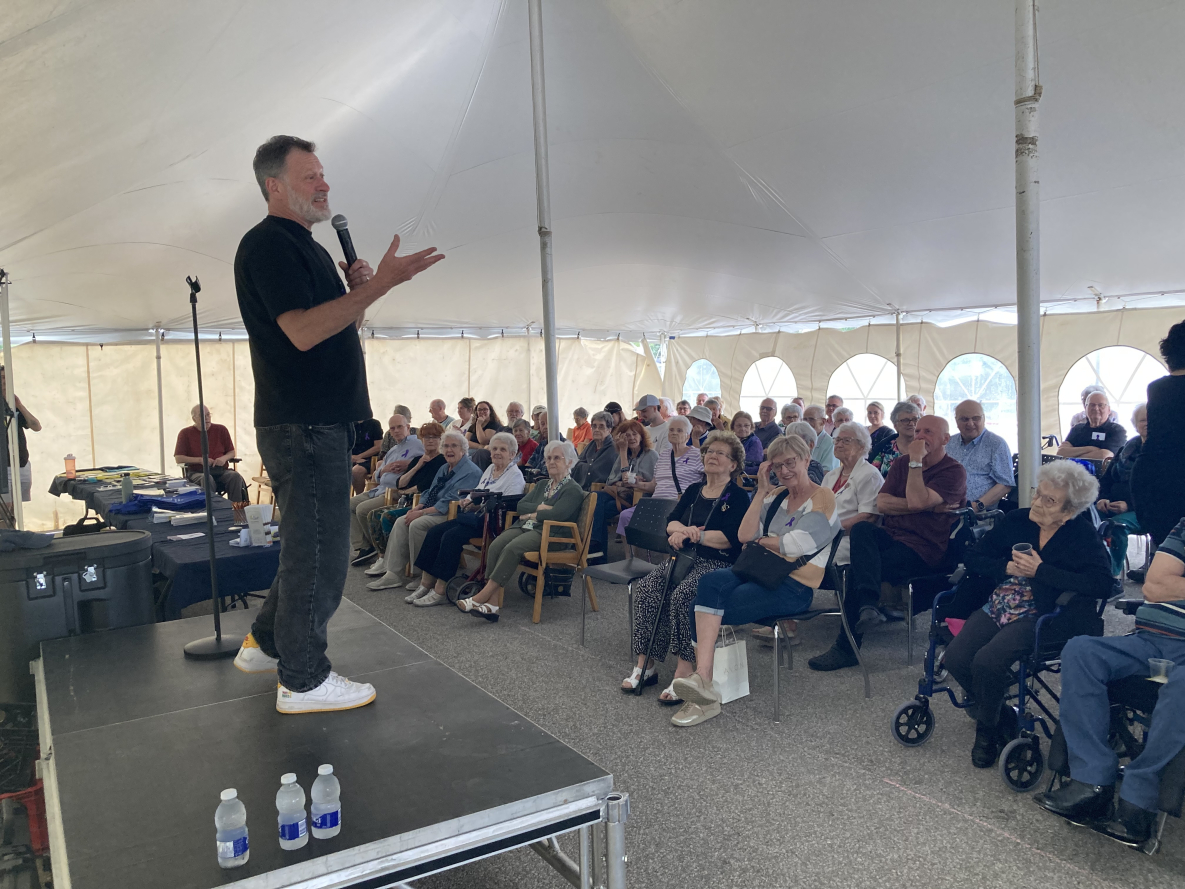 L’activité annuelle soulignant la journée mondiale de lutte à la maltraitance des aînés s’est déroulée dans la gaieté à la Résidence Cardinal-Vachon de Beauport où l’humoriste invité Stéphane Fallu a déridé une centaine de résidants et membres de leurs familles sous un chapiteau spécialement aménagé pour l’occasion à l’arrière de l’établissement.