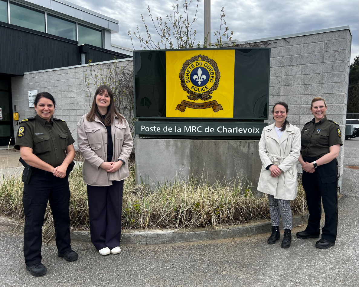 La Sûreté du Québec devient le premier Partenaire éclaireur dans le territoire de la Côte-de-Beaupré, Ile d’Orléans et de Charlevoix. C’est sous le thème « Au cœur de l’action, l’humain avant tout ». Sur la photo, la sergente Mélanie Pouliot, coordonnatrice locale de police communautaire du Centre de services de la MRC de Sainte-Anne-de-Beaupré, Josianne Guimont, coordonnatrice du réseau des éclaireurs dans Charlevoix, Audry-Maude Southière, adjointe territoriale Charlevoix et Marie-Ève Martin, directrice au poste de la Sûreté du Québec de la MRC de Charlevoix. (Photo courtoisie CIUSSS de la Capitale)