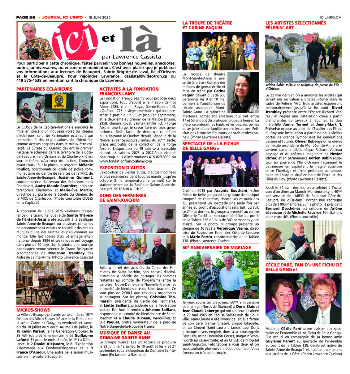 Voici la chronique mensuelle de Lawrence Cassista Notre populaire chroniqueur mondain Lawrence Cassista sillonne le vaste territoire du journal Ici L'Info depuis de nombreuses années. Voici ce qu'il vous propose en activités et en photos dans notre édition de juin. Bonne lecture !