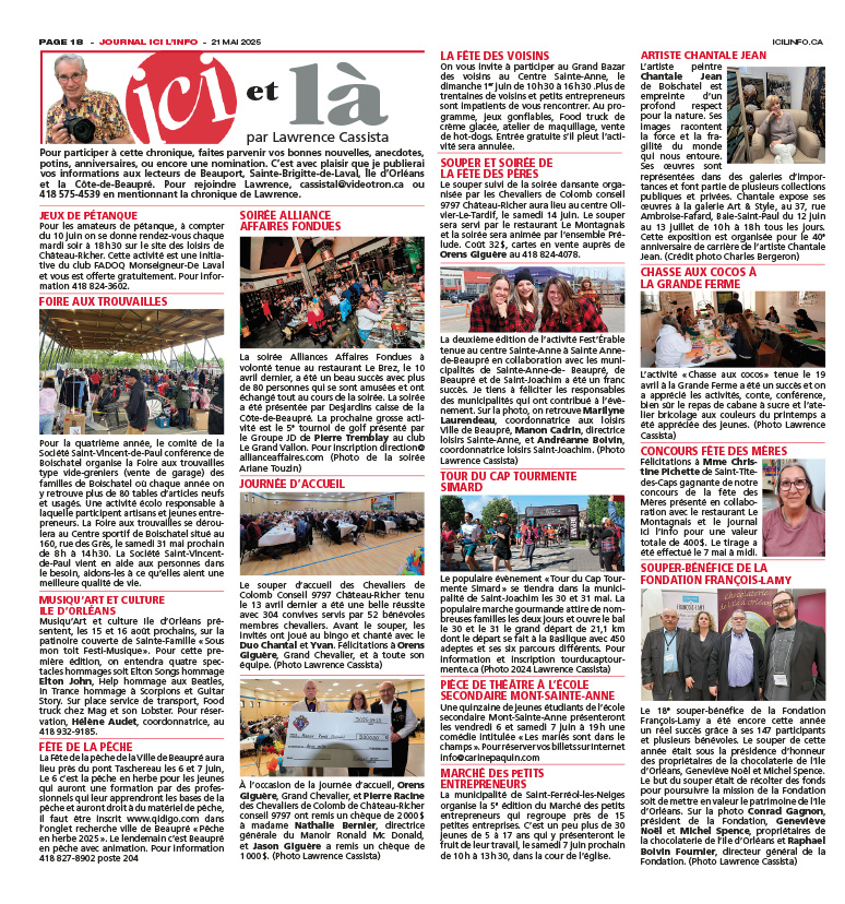 Voici la chronique mensuelle de Lawrence Cassista Notre populaire chroniqueur mondain Lawrence Cassista sillonne le vaste territoire du journal Ici L'Info depuis de nombreuses années. Voici ce qu'il vous propose en activités et en photos dans notre édition de mai. Bonne lecture !