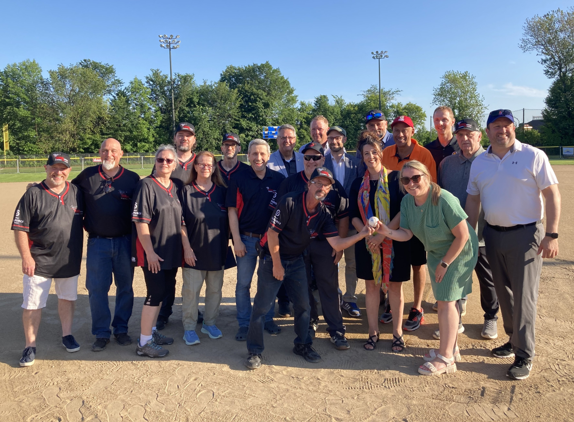 Sur la photo, à l’avant, de gauche à droite, Stéphane Carrier, Denis Poulin, Isabelle Côté, Monique Verret, Jean-François Simard, député provincial de Montmorency, Guillaume Laganière Dallaire et Isabelle Roy, présidente de l’arrondissement Beauport et conseillère municipale du district de Robert-Giffard. À l’arrière, Mathieu Lapointe, Éric Poulin, Pierre Lefrançois, préfet de la MRC de la Côte-de-Beaupré et maire de L’Ange-Gardien, Fred Martineau de Excavation Fred Martineau, Sol Zanetti, député provincial de Jean-Lesage, David Bourgouin de l’Association de baseball Beauport, Stevens Mélançon, conseiller municipal du district de la Chute-Montmorency-Seigneurial, Simon Guérard de l’Association de baseball Beauport, André Bernier, président du Regroupement des organismes sportifs et plein air de Beauport, et Steeve Lavoie, député fédéral de Beauport-Limoilou. (Photo : Michel Bédard)