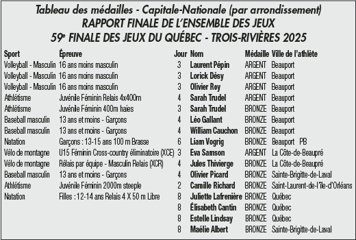 Sarah Trudel de Beauport s’est démarquée parmi les athlètes domiciliés sur le territoire desservi par le journal Ici L’info en étant la seule à décrocher deux médailles, soit celle d’argent en athlétisme féminin relais 4 x 400 m et celle de bronze en juvénile féminin aux 400 m haies. Toutes les émotions vécues feront certainement d’excellentes anecdotes à raconter et de précieux souvenirs à conserver !
