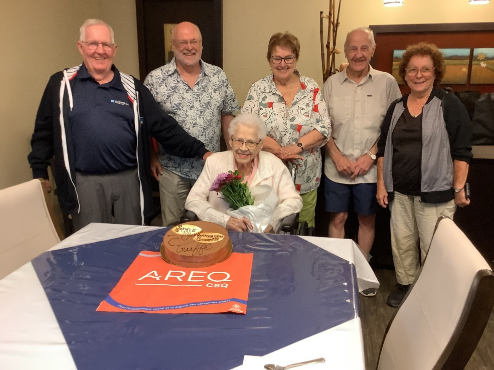 Jeannette fut enseignante une grande partie de sa vie après avoir obtenu son brevet de l’École normale en plus d’avoir élevé sa famille. Sur la photo, Jeannette est entourée de Gilbert Boily, Bernard Deschênes, Pierrette Simoneau, Germain Parent et Michelle Faucher tous membres de l’AREQ.
